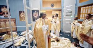 The vocalist, his reinforcement vocalists and artists dressed like ministers playing out a mass in a catholic church for his new music video.