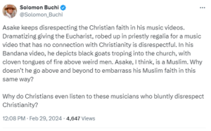 Asake continues to disregard the Christian confidence in his music recordings. Sensationalizing giving the Eucharist, robed up in holy formal attire for a music video that has no association with Christianity is rude. In his Handkerchief video, he portrays dark goats troping into the congregation, with cloven tongues of fire above bizarre men. Asake, I think, is a Muslim. For what reason doesn’t he exceed everyone’s expectations to humiliate his Muslim confidence in this same manner?