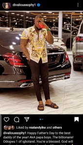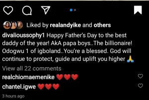 Her caption reads, “Happy Father’s Day to the best Daddy of the year aka Papa Boys. The billionaire! Odogwu 1 of Igboland. You are blessed. God will continue to protect, guide and uplift you”.