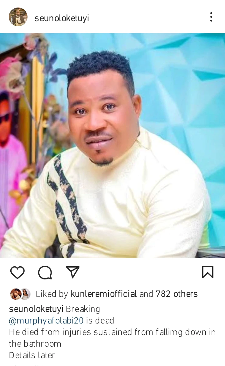 “Breaking. Murphy Afolabi is dead. He died from injuries sustained from falling in the bathroom. Details later”, Seyi Oloketuyi.