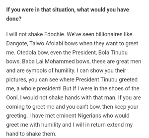 King AbdulRasheed Akanbi said, “as a custodian of the Yoruba culture and tradition, I won’t shake hands with Pete Edochie if I were in same situation as the Ooni of Ife. If you are approaching to greet me and you can’t bow (before me), then keep your greeting.” He added, “I have actually met eminent Nigerians who would greet me with humility and I will in return extend my hand to shake them.”