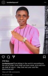 The overwhelming news was transferred by his kindred entertainer, Tunde Olayusuf, who took to his Instagram page to share a photograph of Sisi Quadri while reporting the miserable turn of events.