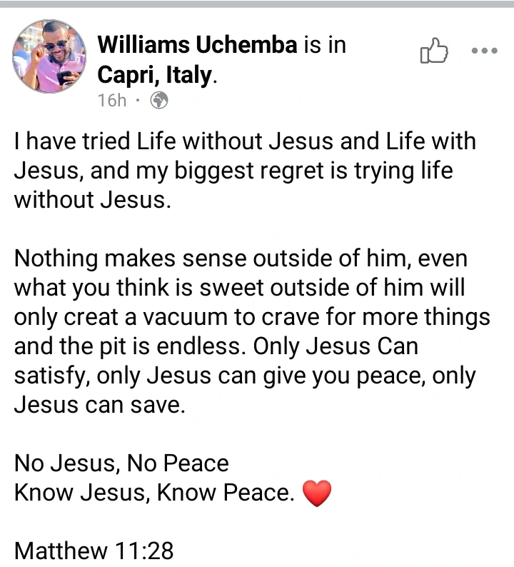 “I have tried life without Jesus and Life with Jesus and my biggest regret is trying life without Jesus. Nothing makes sense outside of him, even what you think is sweet outside of him will only create a vacuum to crave for more things and the pit is endless. Only Jesus can satisfy, only Jesus can give you peace, only Jesus can save”, Williams Uchemba wrote and it stirred massive reactions from fans, viewers and followers with many taking to the comment section to react.
