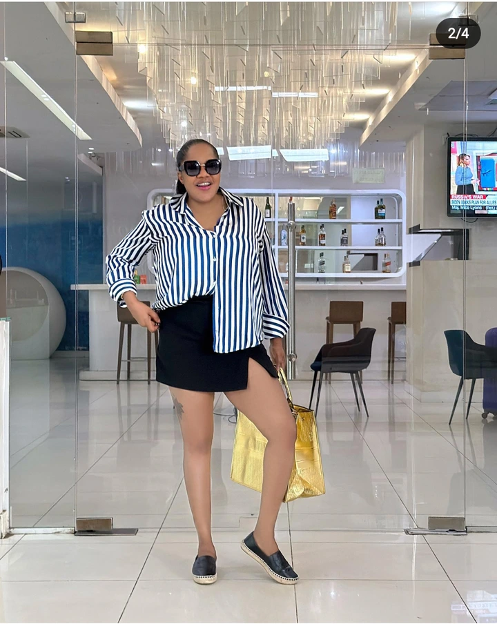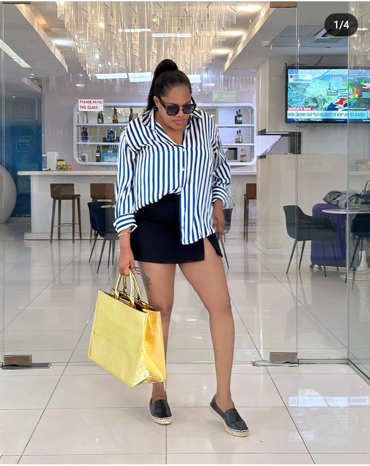 In her new post, she showed up in a T-shirt and a mini-skirt that looked good on her. She applied nicely done makeup to her face that matched the color of her skin. She appeared with a beautiful hairdo that enhanced her beauty. She put on a black sunshade and sneakers as she took the pictures in a standing position.