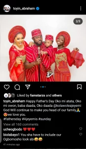 The talented actress wished the man of her dreams a happy Father’s Day and called him a good father and husband. Toyin prayed that God will continue to make him the head of the family and that they love him so much.